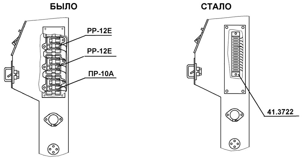 Для удобства обслуживания трактора ДЭТ-320 и повышения надежности три блока предохранителей РР-12Е (2 шт.) и ПР-10А заменены одним новым блоком предохранителей 41.3722.