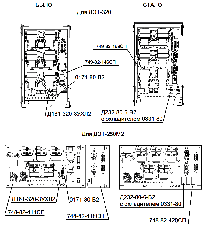 В связи с вводом на тракторах аккумуляторных батарей закрытого типа (с залитыми мастикой перемычки между банками) введены контакторнаые панели 749-82-169СП (на ДЭТ-320) и 748-82-420СП (на ДЭТ-250М2) стремя последовательно соединенными диодами Д232-80-6-В2 с охладителями 0331-80 взамен контакторнаых панелей 749-82-146СП (ДЭТ-320) и 748-82-414СП или 748-82-418СП (ДЭТ-250М2) с одним диодом Д161-320-ЗУХЛ2 с охладителем 0171-80-В2.