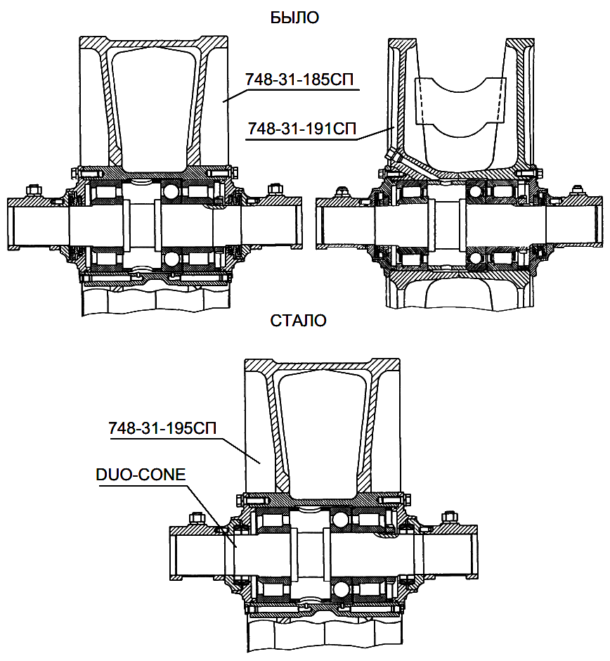 С целью исключения течи смазки, увеличения срока службы и унификации направляющих колес установлены направляющие колеса 748-31-195СП с уплотнением DUO-CONE взамен направляющих колес 748-31-185СП (на ДЭТ-250М2) и 748-31-191СП (на ДЭТ-320).