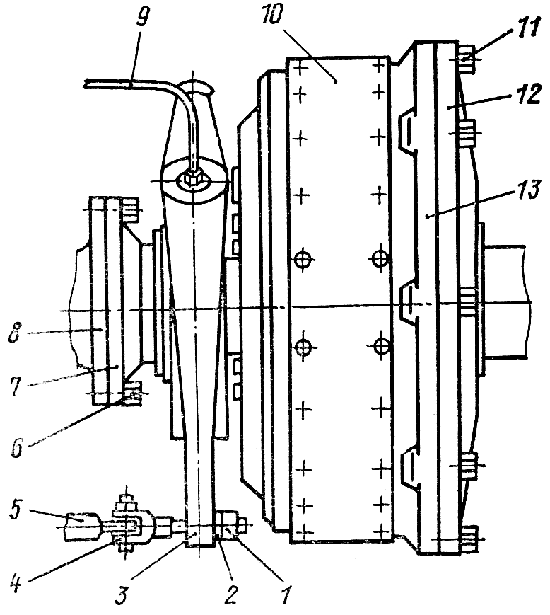 Отсоедините трубку 9 ( рис. 230 ) подвода смазки к рычагам 3 бортовых фрикционов. Отверните контргайку 1 и шаровую гайку 2. Отсоедините вилку 4 от рычага 5, отверните болты 6, прикрепляющие фланец полуоси 7 к фланцу 8 вала конической шестерни. Отверните торцовым ключом болты 11, крепящие наружный барабан 13 к ведущему фланцу 12, через отверстие в корпусе бортовых фрикционов, из которого была вывернута пробка 1 ( см. рис. 229 ).