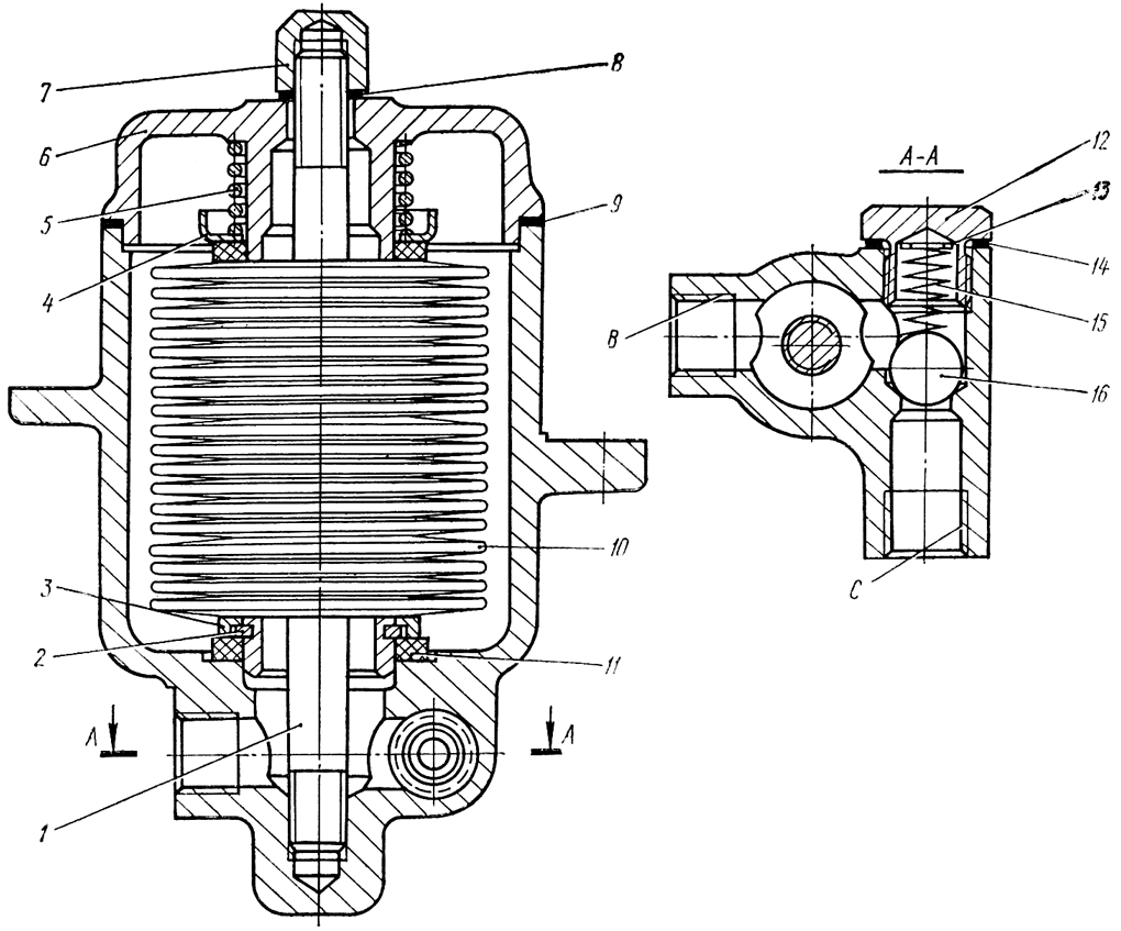 Выверните из корпуса фильтра штуцер 12 снимите с него уплотнительное кольцо 14, выньте шайбу 13. Выньте из корпуса фильтра пружину 15 и шарик 16. При износе резьбы выверните из корпуса шпильку 1.