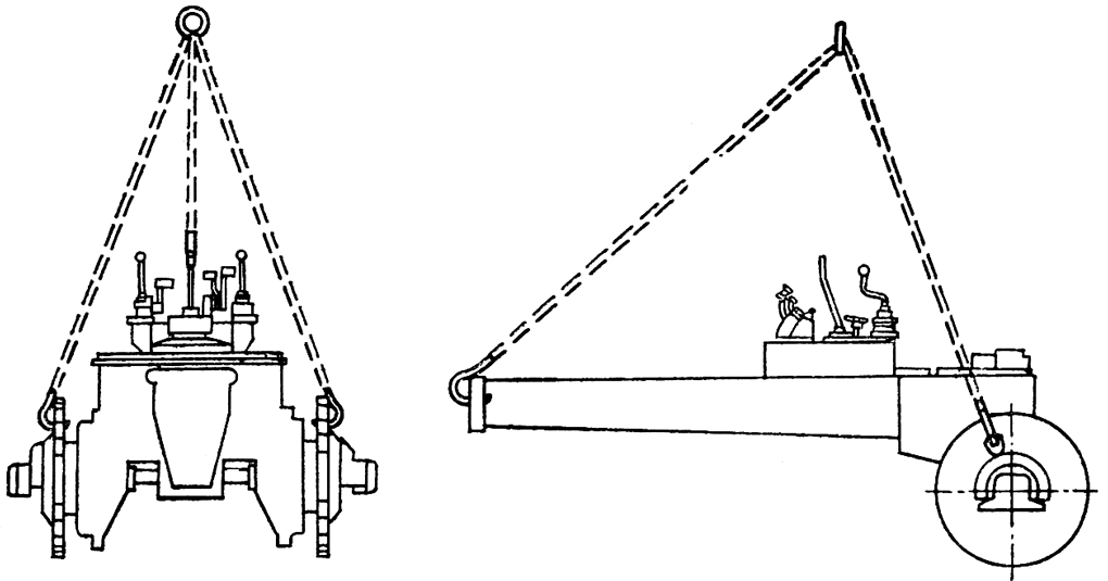 Присоедините трансмиссию к подъемнику ( рис. 268 ). Выбейте палец рессоры (см. раздел «Балансирная рессора»). Снимите трансмиссию с тележек трактора и поставьте на подставку для дальнейшей разборки. Разберите бортовые редукторы. Снимите бортовые фрикционы, коробку передач и главную передачу.