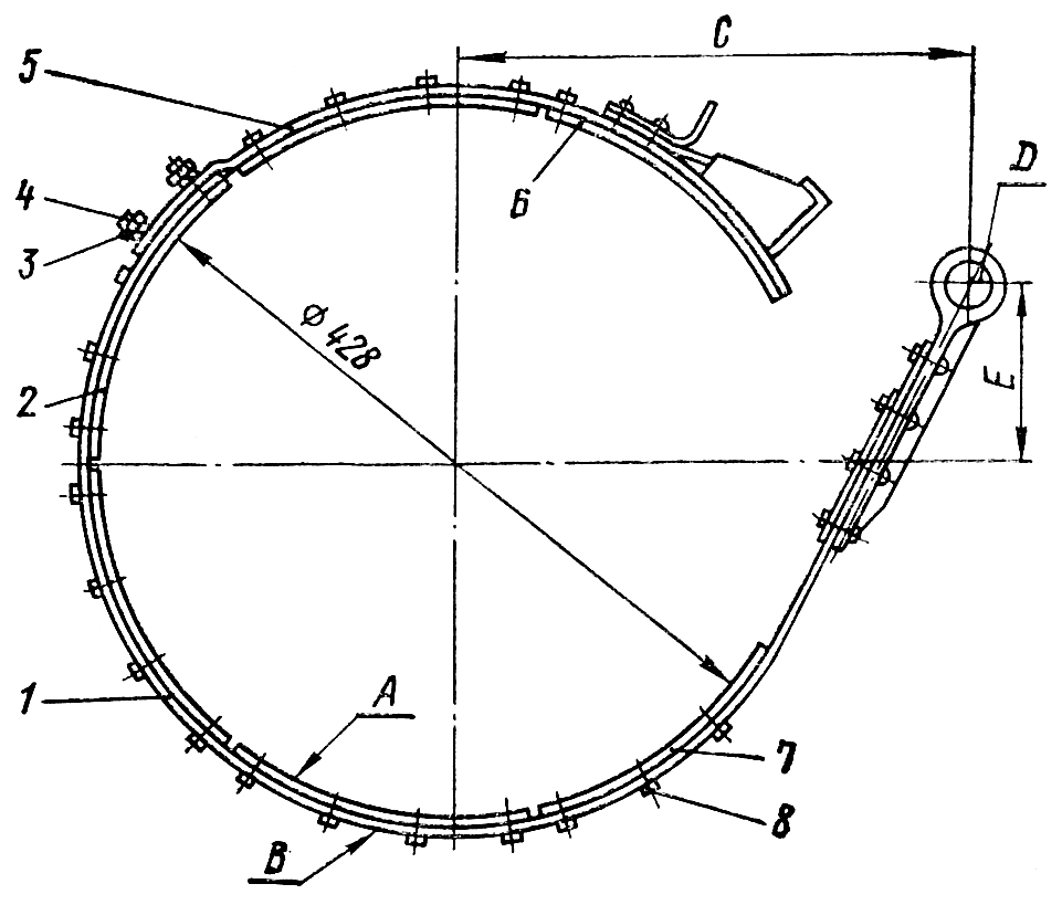 Головки заклепок ленты тормоза не должны иметь неполной расклепки и большого смещения. Допускаются надрывы на головках заклепок в количестве не более шести штук на всей ленте. Допускаются местные зазоры между накладкой и лентой вне зоны заклепок, не более 0,4 мм на дуге 30° на глубине не более 20 мм от края ленты, в количестве не более четырех на каждой накладке. Соедините нижнюю и верхнюю части ленты, наложив верхнюю часть 5 на выступающие болты 4 нижней части 1, и наверните на болты гайки 3 с шайбами. Проверьте прилегание ленты к поверхности барабана с наружным диаметром (428±0,5) мм в такой последовательности:
