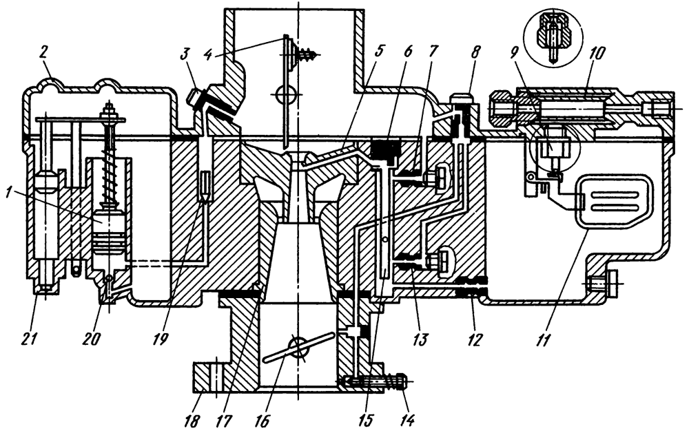 Вывернуть пробку 6 карбюратора и продуть главный жиклер. Очистить от грязи камеру, закрываемую пробкой.