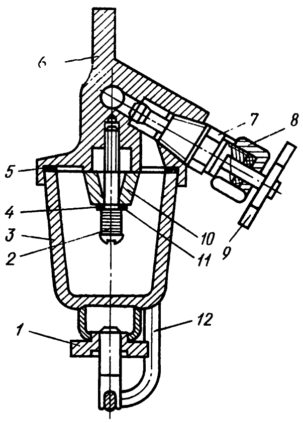 В отстойнике собираются вода и осадок топлива. Для их удаления нужно закрыть запорный вентиль пускового бачка и снять стакан отстойника, отвернув гайки дужки, крепящей его к корпусу. Затем следует отвернуть винт крепления фильтрующего элемента и промыть последний в бензине. При установке стакана отстойника необходимо проверить, чтобы прокладка была чистой, целой и лежала в правильном положении.