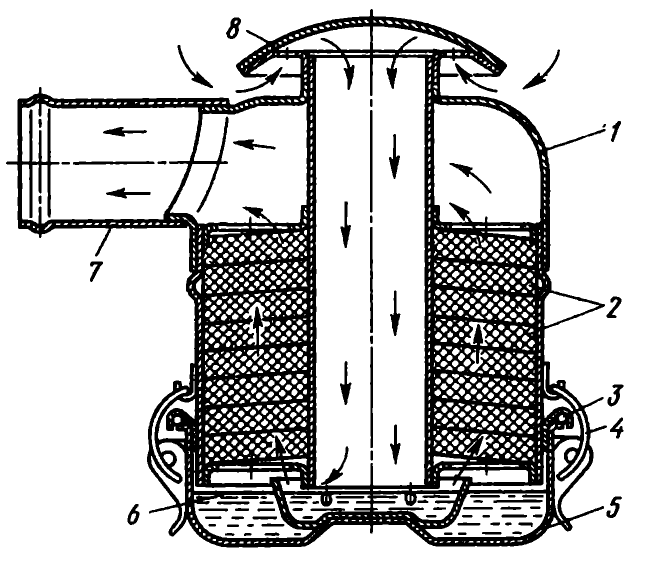 В ванну воздухоочистителя заливают отработанное картерное масло до отверстий внутренней чашки. Зимой масло разбавляют дизельным топливом или керосином на 1/3 объема.
