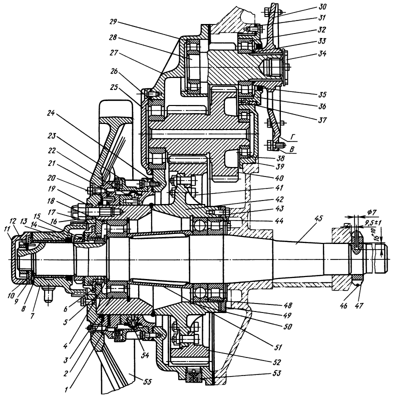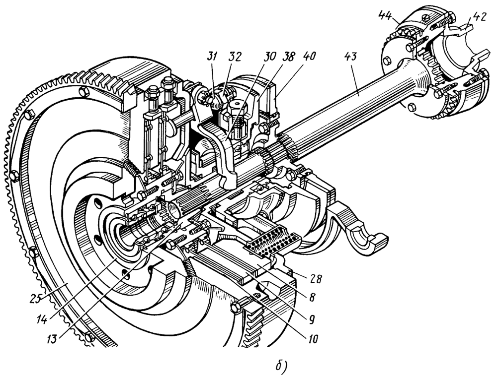 В теплое время года масло идет по большому кругу и охлаждается в радиаторе, который устроен, как и масляный радиатор двигателя. Маслом смазываются следующие точки коробки передач и главной передачи: втулки шестерен (стрелки г и д), правый (стрелка е) и левый (стрелка ж) подшипники.