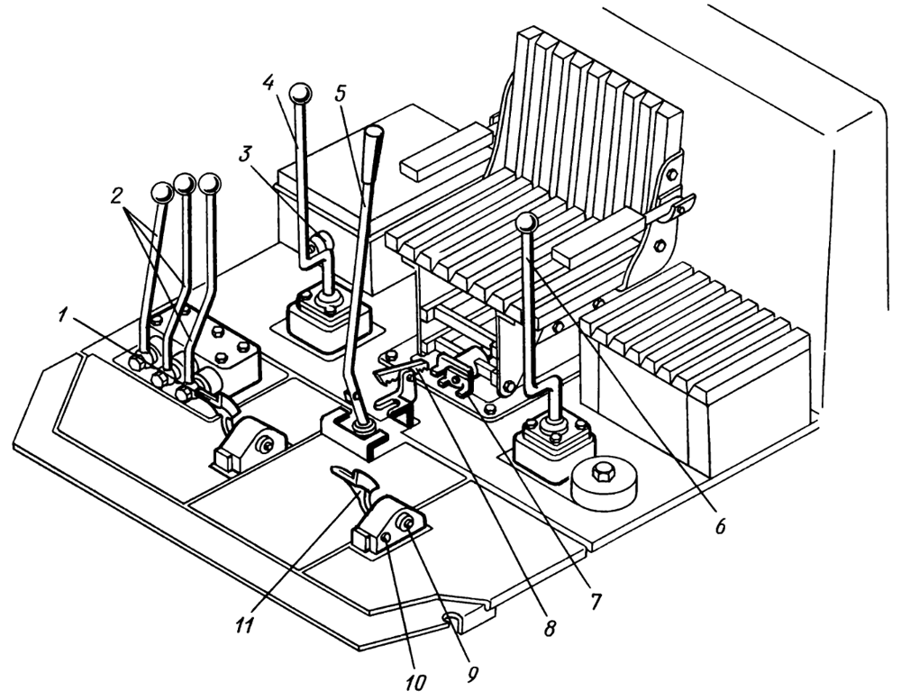 2 — рычаги распределителя гидронавески (гидросистемы навесного оборудования),