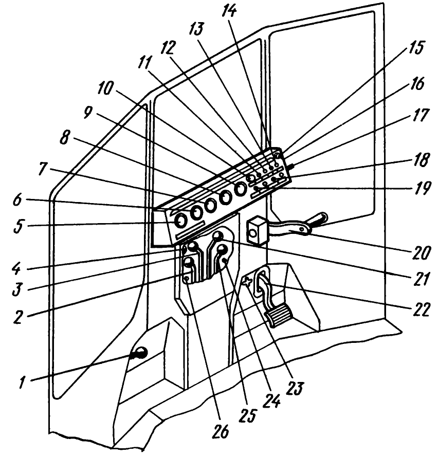Рукоятка 20 акселератора и педаль 22 деселератора расположены справа на передней стенке кабины. Верхние положения рычага и педали соответствуют максимальной подаче топлива. Чтобы переключить скорость или временно остановить трактор, перемещают педаль вниз до упора, в результате подача топлива уменьшается, а обороты дизеля снижаются до минимальных. Для уменьшения частоты вращения двигателя на длительное время следует рукоятку акселератора опустить вниз. В крайнем нижнем положении акселератора полностью выключена подача топлива.