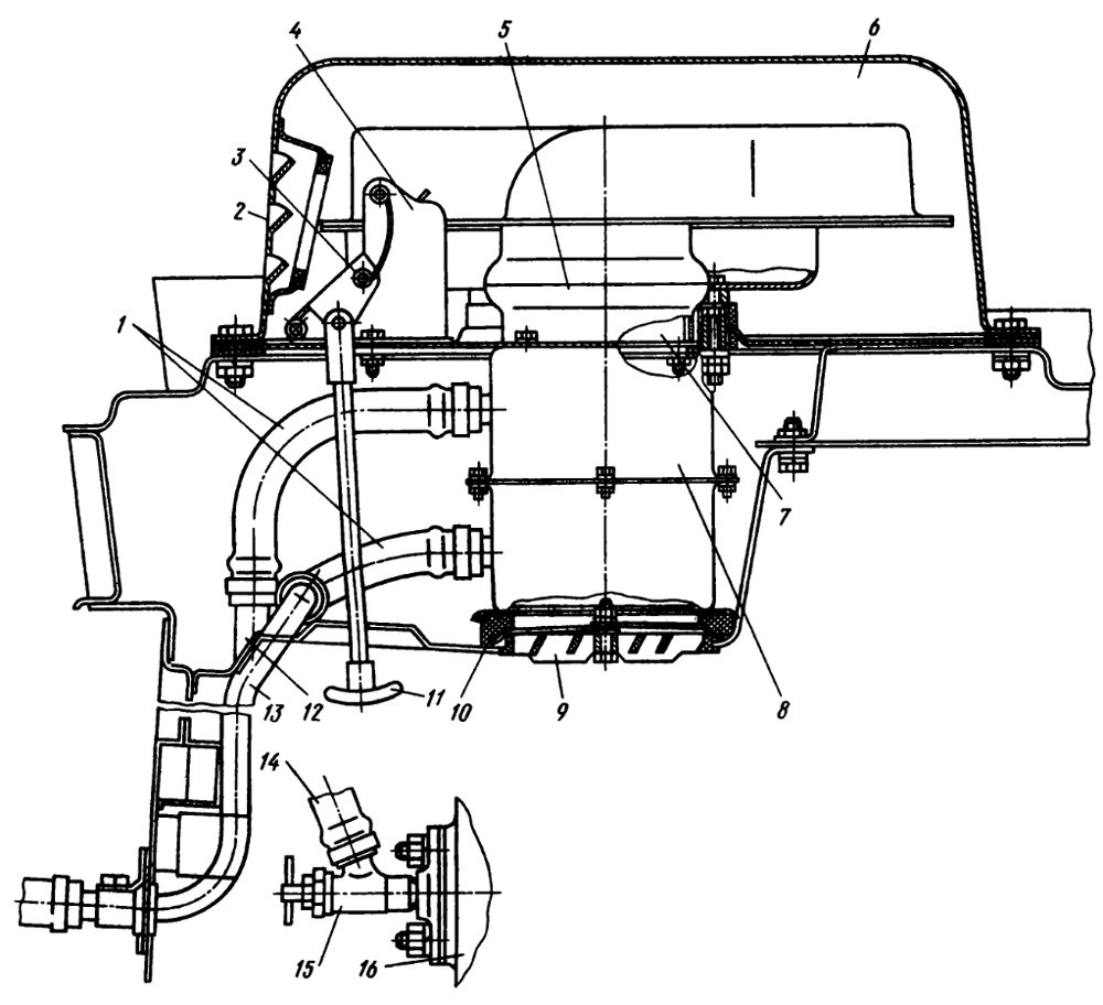 13 — труба отвода воды из радиатора-темплообменника в водоотводную трубу дизеля,