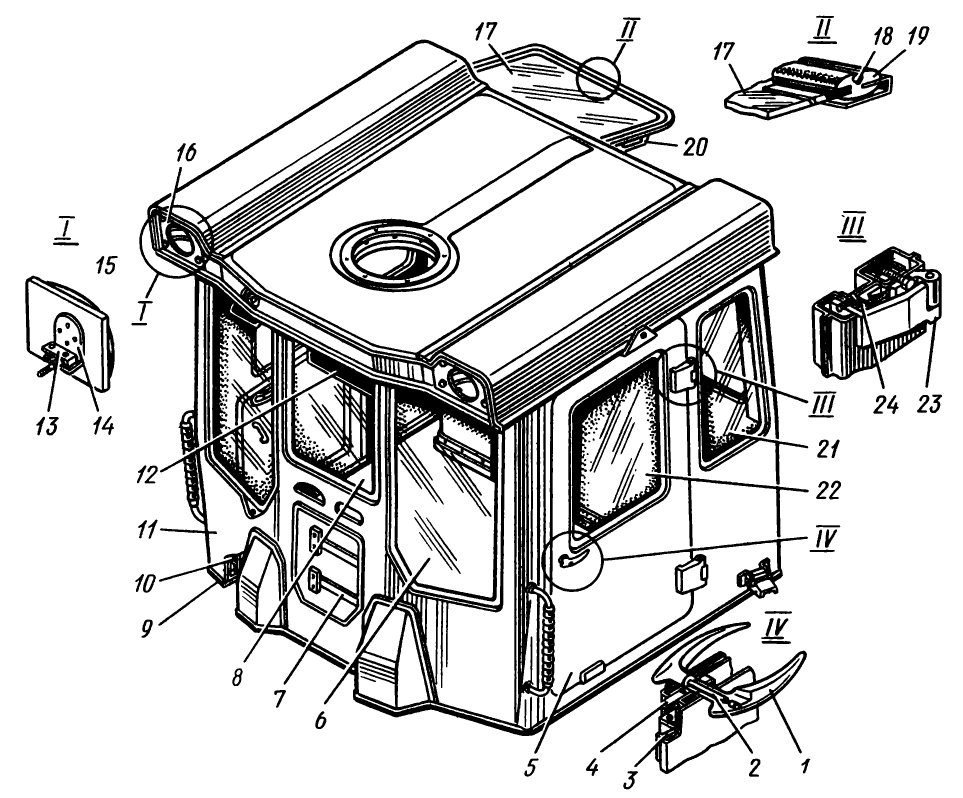 Внутри кабины имеется крючок для одежды, зеркало 15 на сферической опоре. Солнцезащитный козырек 12 крепится к передней стенке кабины.
